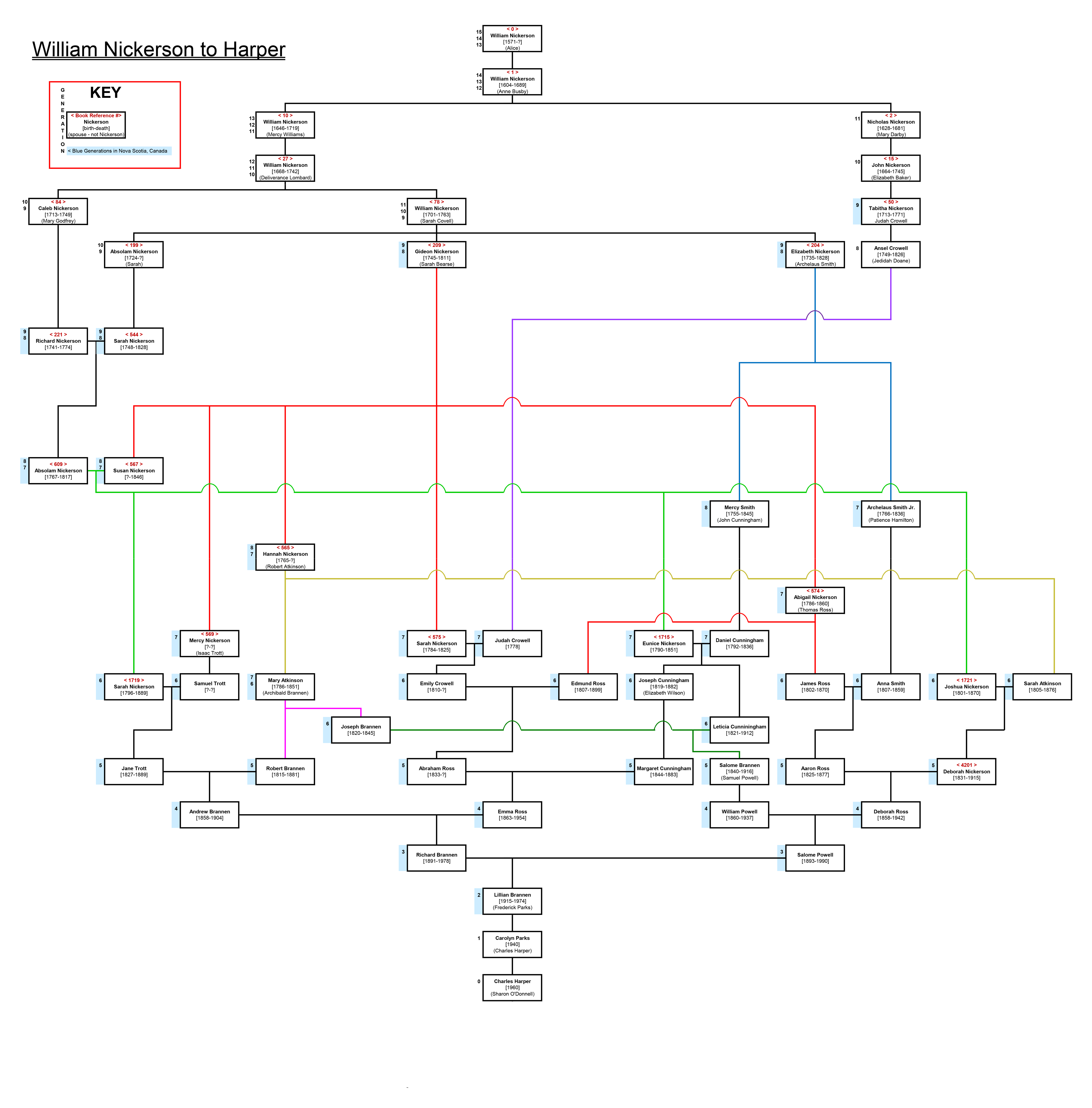 Lillian Brannen's lineage (on both sides) can be traced back 5-6 generations to Archelaus Smith on Cape Sable Island and Barrington, Nova Scotia, Canada. Surnames include Brannen, Powell, Ross, Nickerson, Trott, Cunningham, Atkinson, Crowell, Wilson, Shaw, Hamilton, Doane, Barss and Smith. Archelaus Smith's pedigree can be further traced back another 5 generations to Stephen Hopkins of the Mayflower. Surnames include Smith, Brown, Snow, Mulford, Rogers, Whelden, Deane, Ring and Hopkins. A 15-generation pedigree chart for Lillian is found below. There is an Archelaus Smith Museum on Cape Sable Island which contains many genealogical records and island artifacts:
